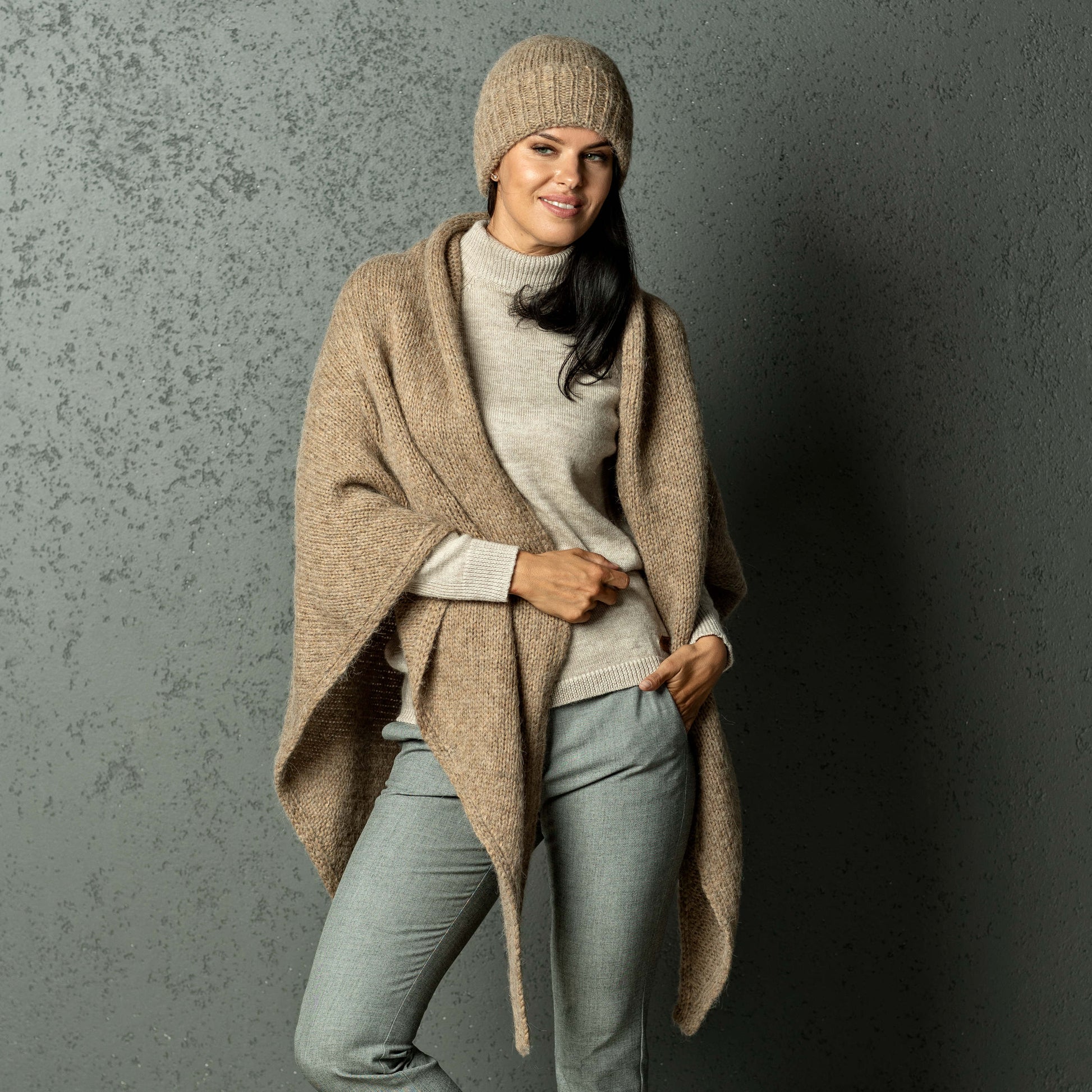 Chunky Knit triangle alpaca wool Scarf and hat - camel