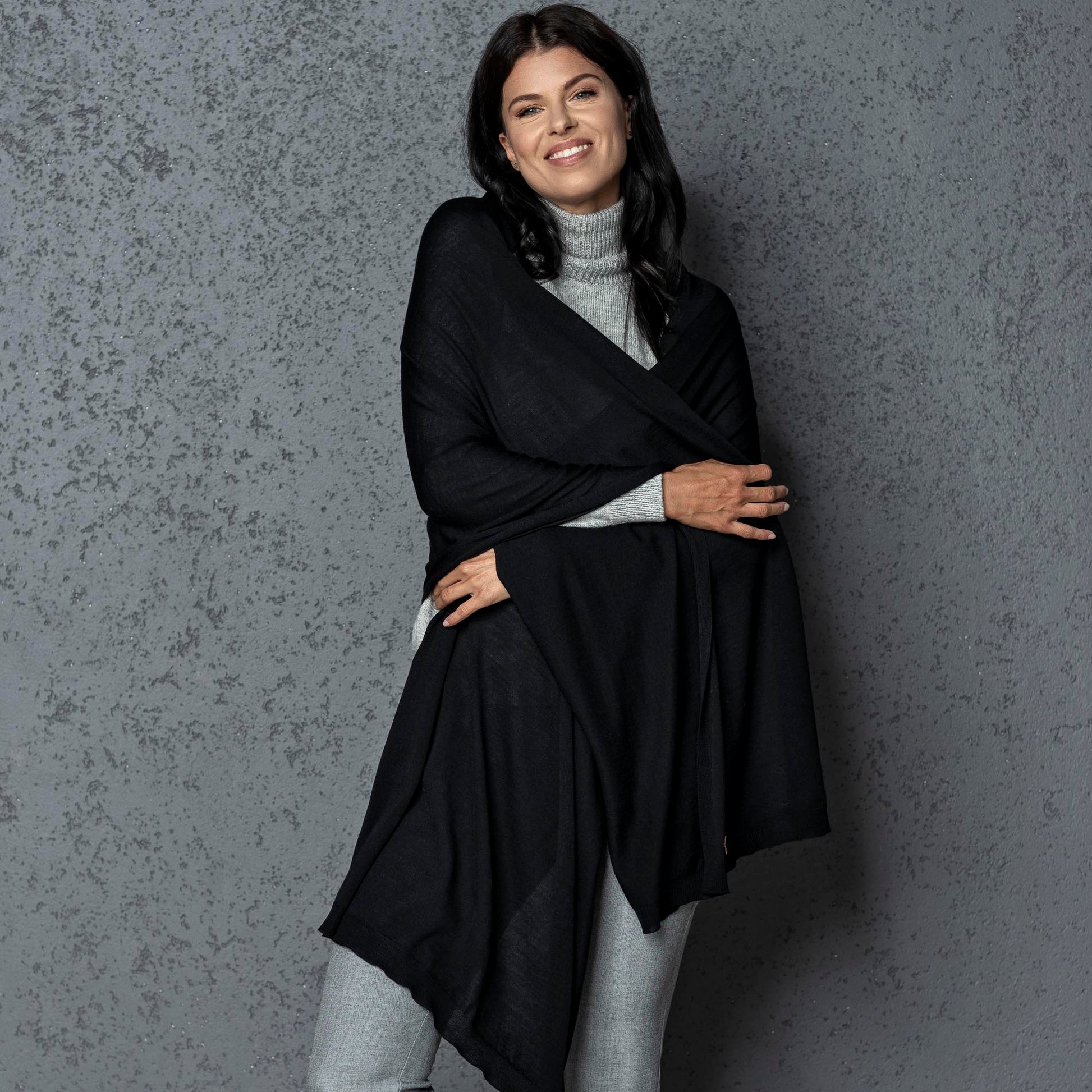 Knit wide minimalist 100% merino wool Wrap - Scarf and hat - AGNES, black