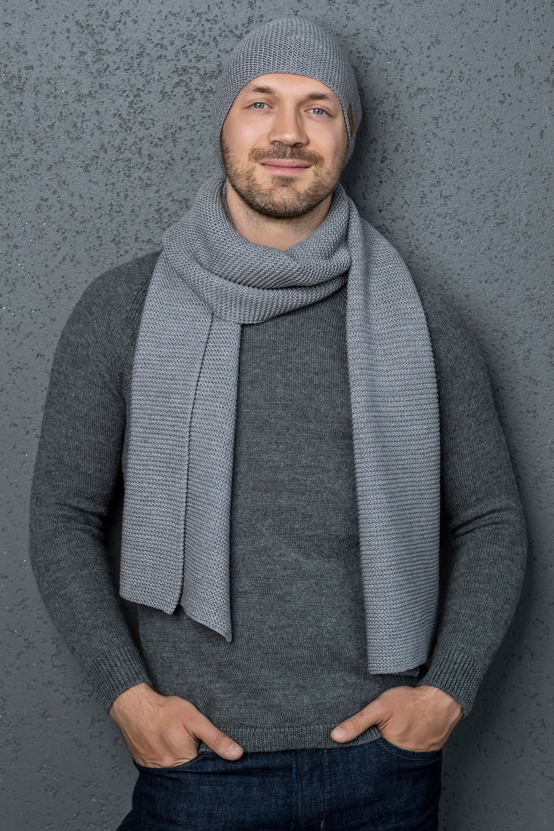 Man merino wool knit scarf and cap - light gray