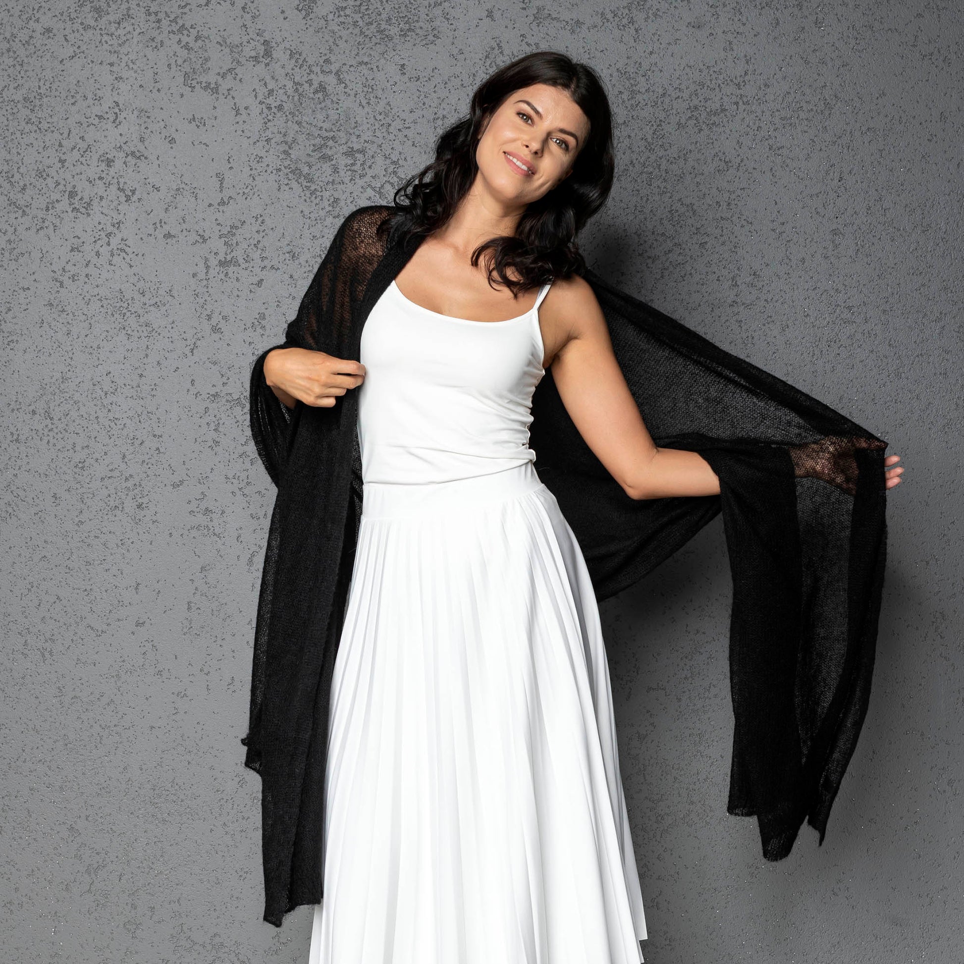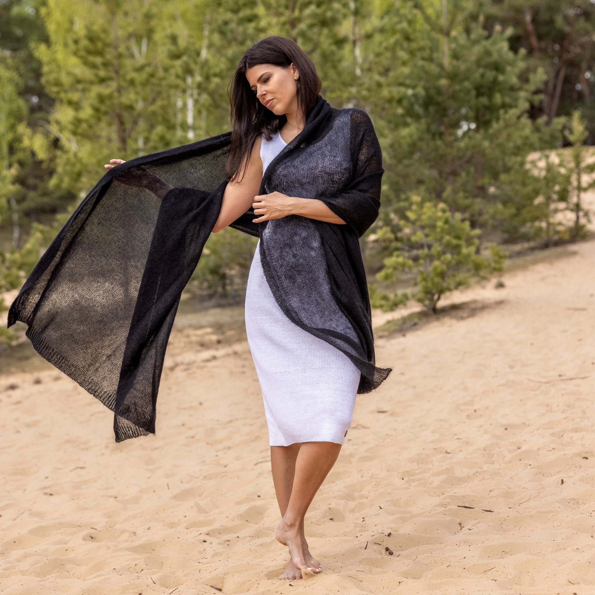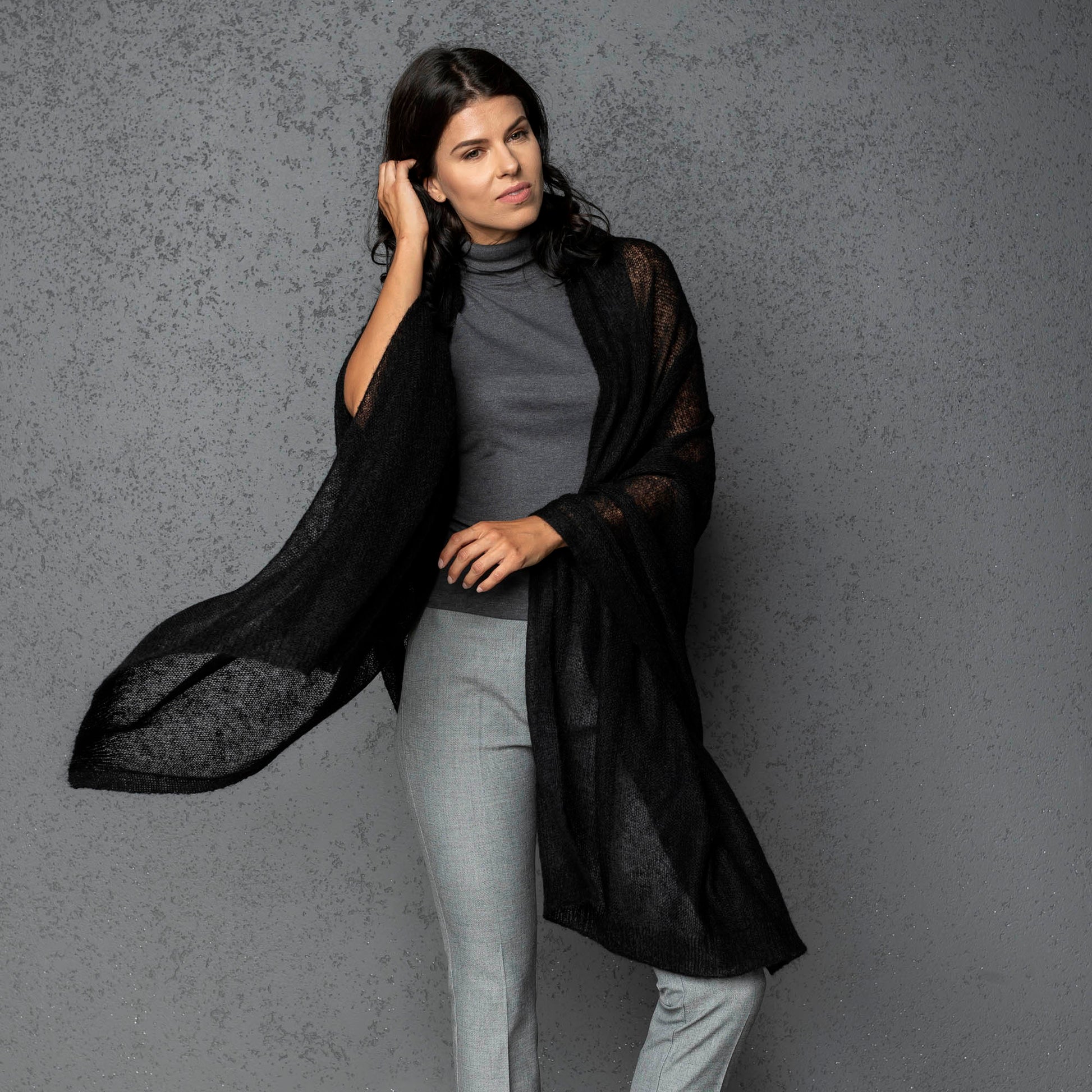 Knitted mohair wool wrap, black wool wrap, wide mohair wrap, summer shawl, knitted light shawl, knitted wool wrap, light wrap, mohair wrap